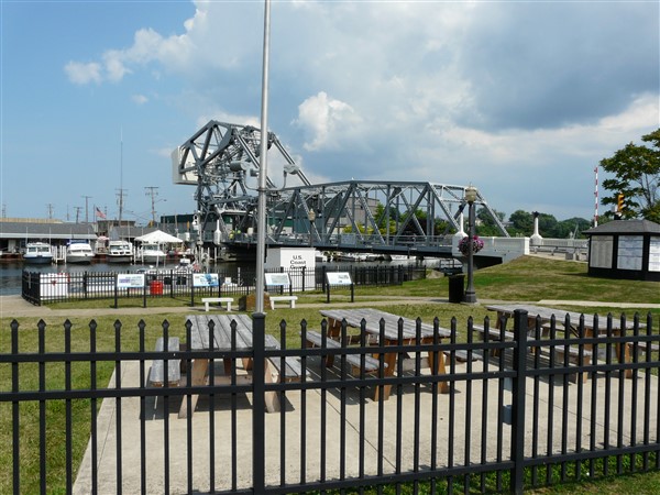 Back to Ashtabula. This is the 'lift bridge' from the Ashtabula River into Lake Erie. The road leads to Bridge Street, described in the plaque below. We didn't see the bridge in the up position all the while we were there. I think they were doing some repairs.